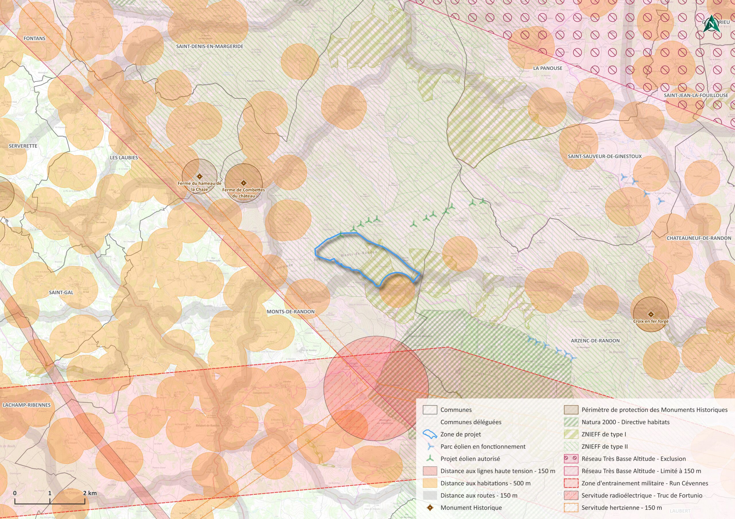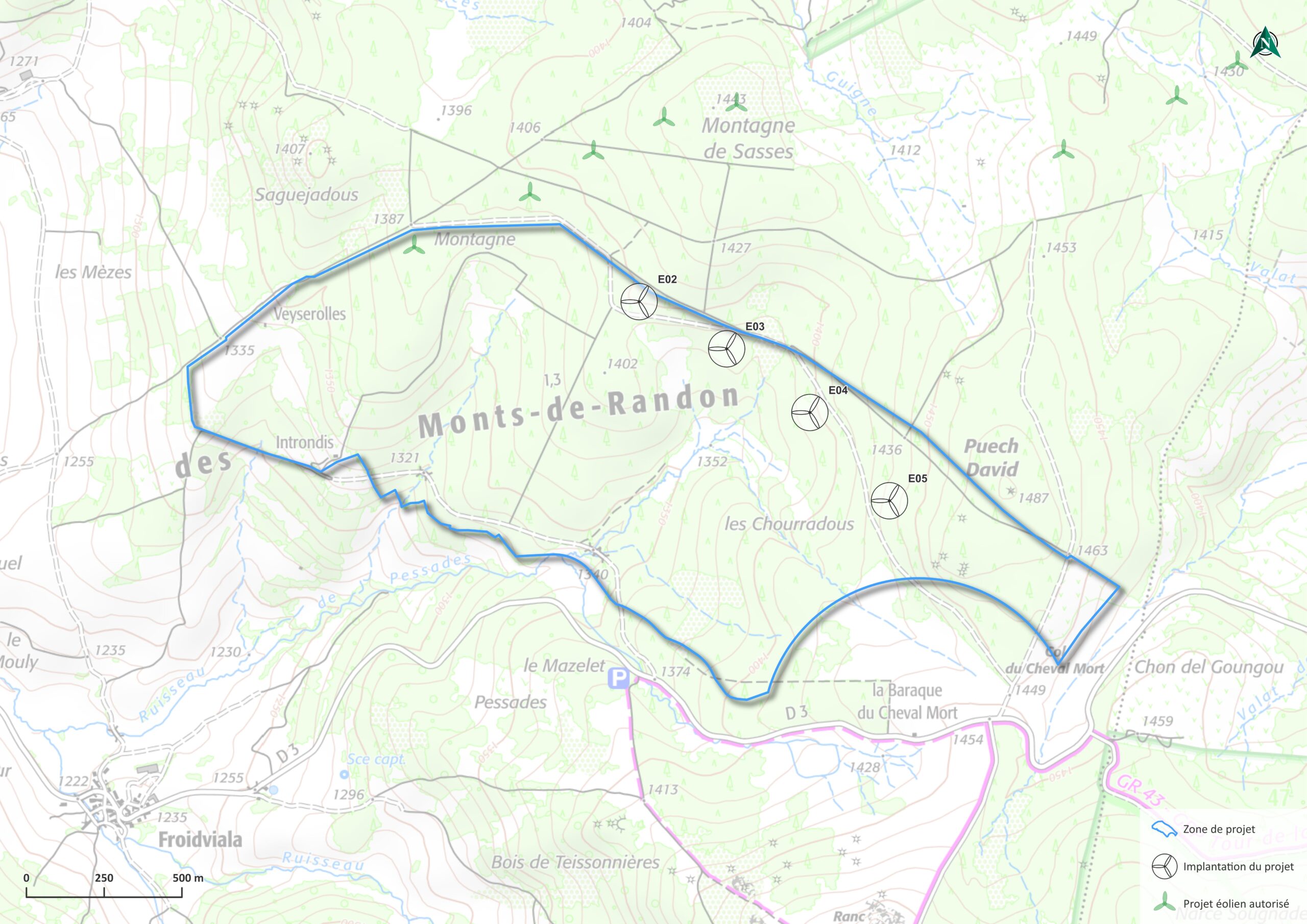 Le projet est situé dans un secteur adapté à l’implantation éolienne. Il s’inscrit en effet au sein d’une forêt de plantation de résineux, dans un paysage de plateaux boisés et vallonnés, où la variation de relief est importante. Des masques importants sont notamment générés par les reliefs de la Montagne de la Margeride. Le projet s’intègre sur une pente orientée sud, limitant ainsi les vues depuis le nord.